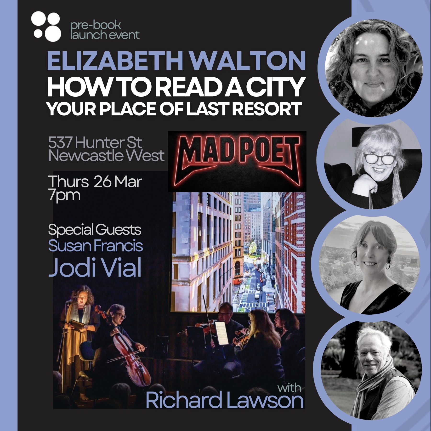 Join us at @madpoetnewcastle Thurs 26 March for a night of new poetry at the very first pre-launch reading of Elizabeth Walton’s @elizabethwalton.au debut short collection, How To Read A City, Your Place of Last Resort, which will be published by 5 Islands Press @5islandspress in 2026. Elizabeth Walton is a writer and musician who has been shortlisted in many literary prizes. This new work asks where to find hope while living through the challenges of climate change. It is a collaboration with Richard Lawson @richardlawsonmusic – a triple ARIA-nominated punk rock drummer who was the first drummer to appear on ABC’s Rage, performing with the Lime Spiders. His song cycle for string quartet, How To Read A City, Your Place of Last Resort, performed by Acacia Quartet, was included in the ABC Limelight Australian Art Music playlist in 2025. Elizabeth’s poetry reading with Acacia at the world premiere is featured on the cover of her new book. Elizabeth will be appearing at Newcastle Writers Festival with the Macquarie/Westwords project, Nurejev’s Foot. @westwords_books